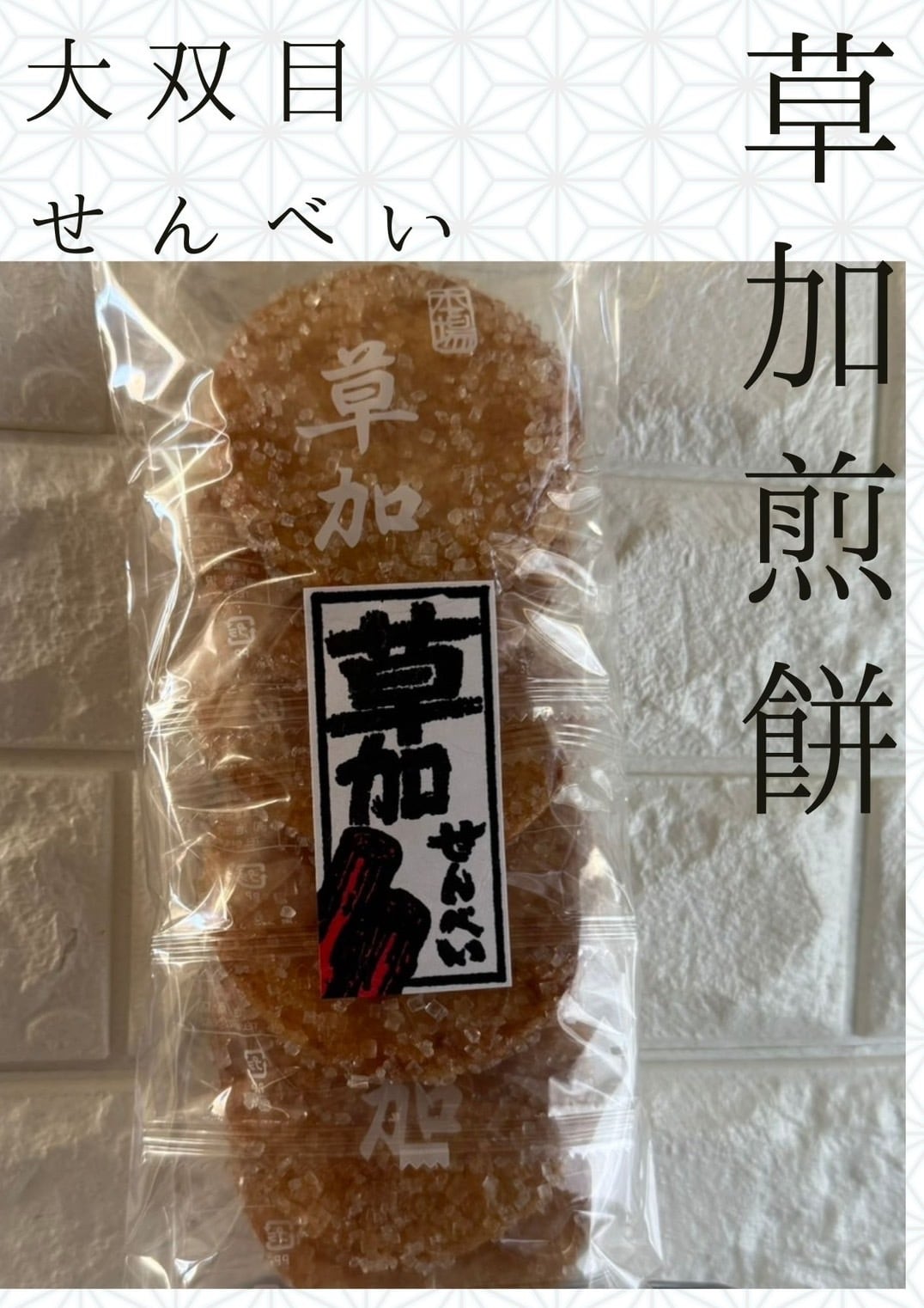 ■草加せんべいの特長:・国産のうるち米を使用し、香ばしく焼き上げた伝統の味わいが楽しめます。・大双目の特別製法により、パリッとした食感と共に豊かな風味が広がります!・お茶うけやお酒のお供に最適で、どんなシーンでも楽しめる逸品です。