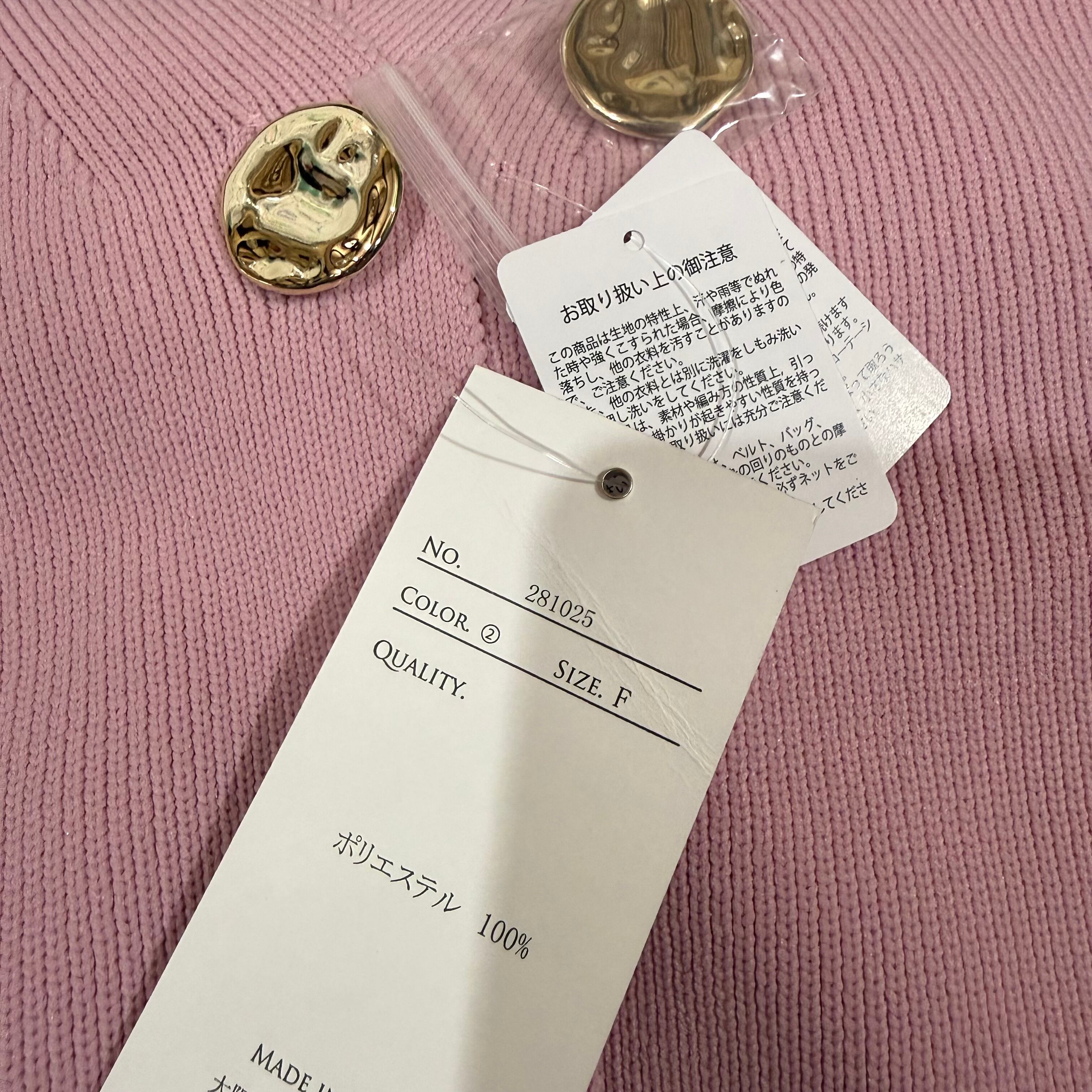 シャンパンゴールドの表面感のある大きめボタンがポイントになり、シンプルながら表情のある一枚に仕上げています